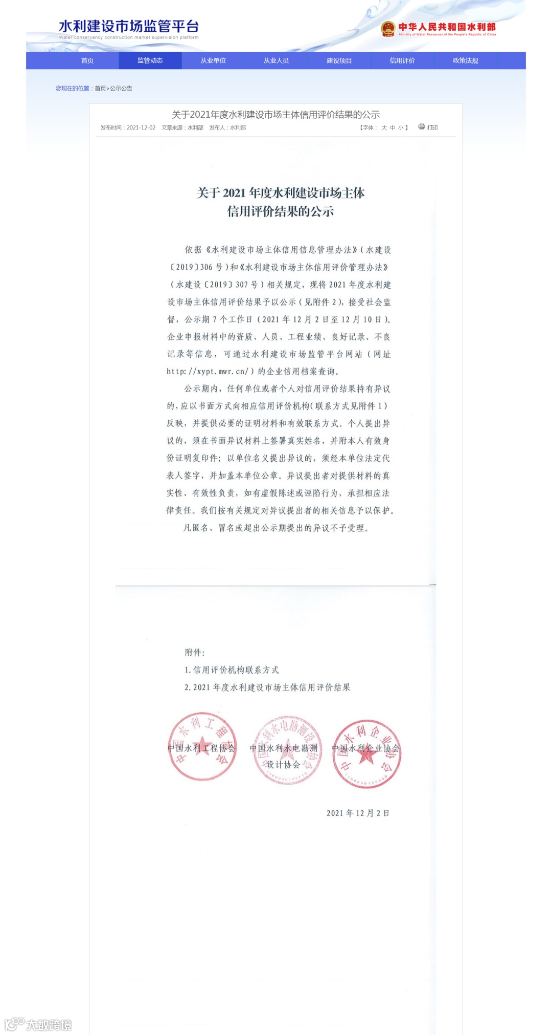 2021年12月3日——12月10日水利部水利建设市场监管平台官网公示了《2021年度水利建设市场主体信用评价结果》,我公司获得2021年度AAA级水利建设市场主体信用评价。