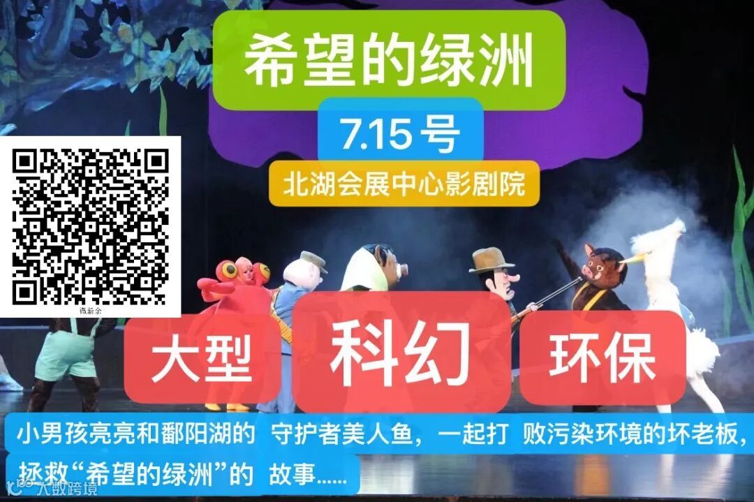 大型科幻环保木偶卡通音乐剧《希望的绿洲》 是以美丽的鄱阳湖为背景,讲述一名没有环保意识的小学生亮亮意外遇到了鄱阳湖的守护者美人鱼,在美人鱼的引导下,亮亮对环境保护有了新的认识,并与美人鱼成为了好朋友。