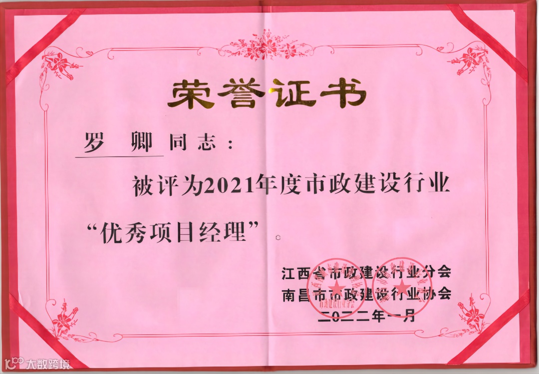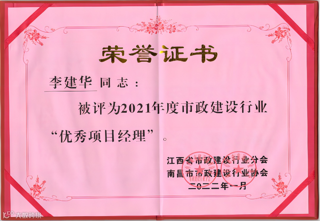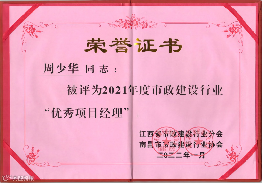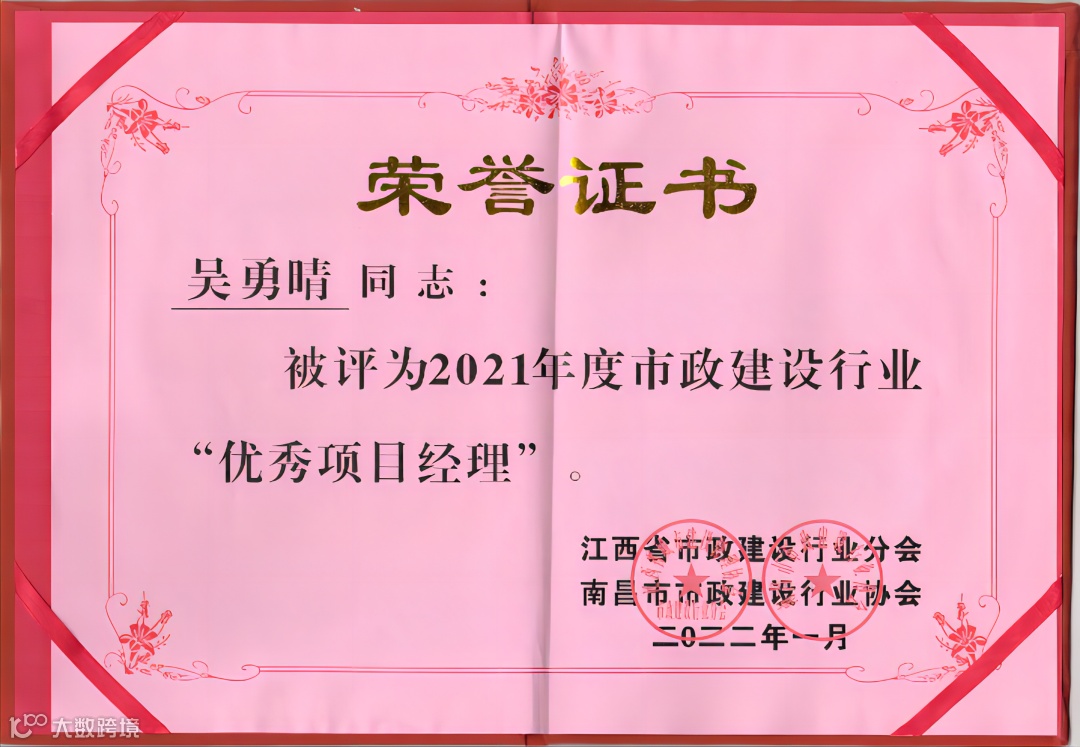 近日,公司参与江西省市政建设行业分会、南昌市市政建设行业协会开展的2021年度市政行业先进单位和市政建设行业优秀项目经理的评选工作中,我公司荣获了“2021年度市政建设行业先进单位”荣誉,公司骨干管理人员中9人获评为“2021年度市政建设行业优秀项目经理”。