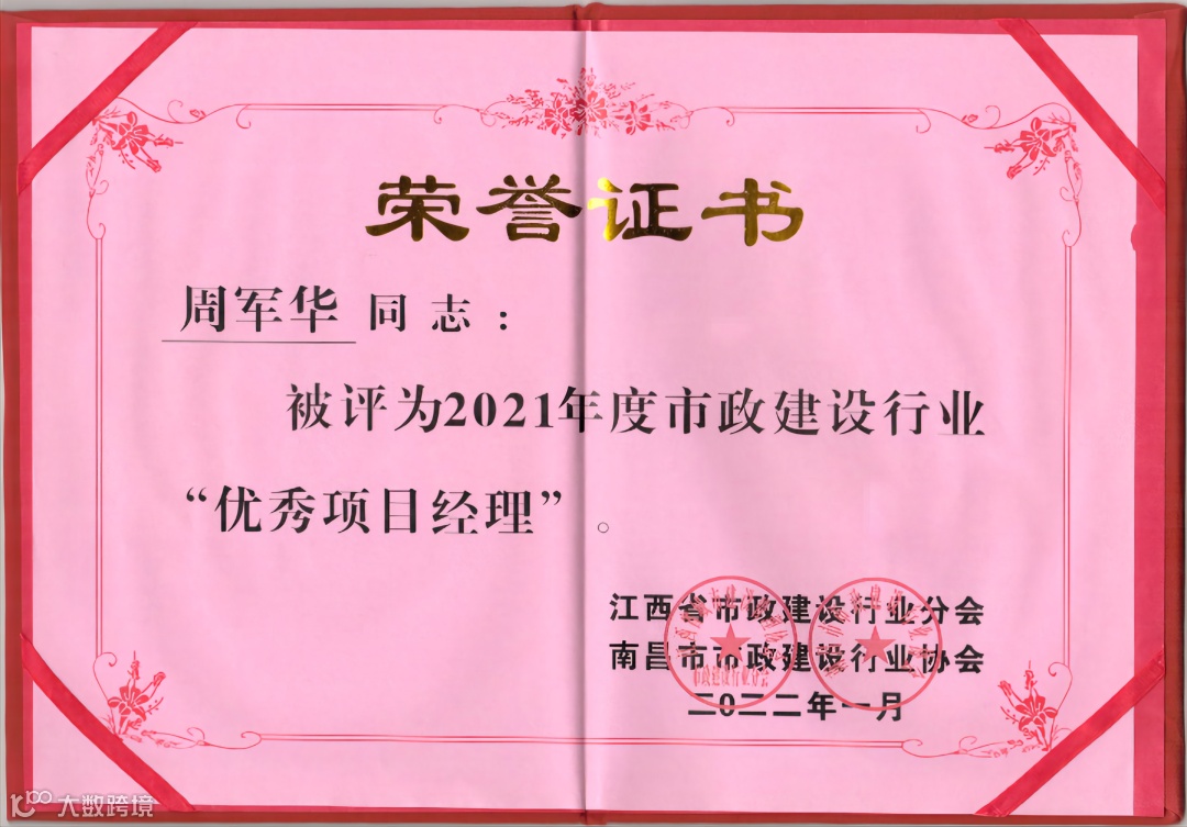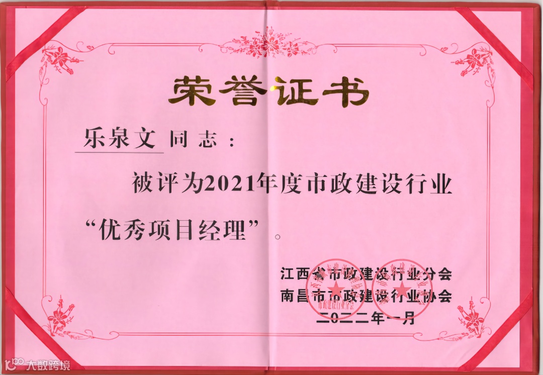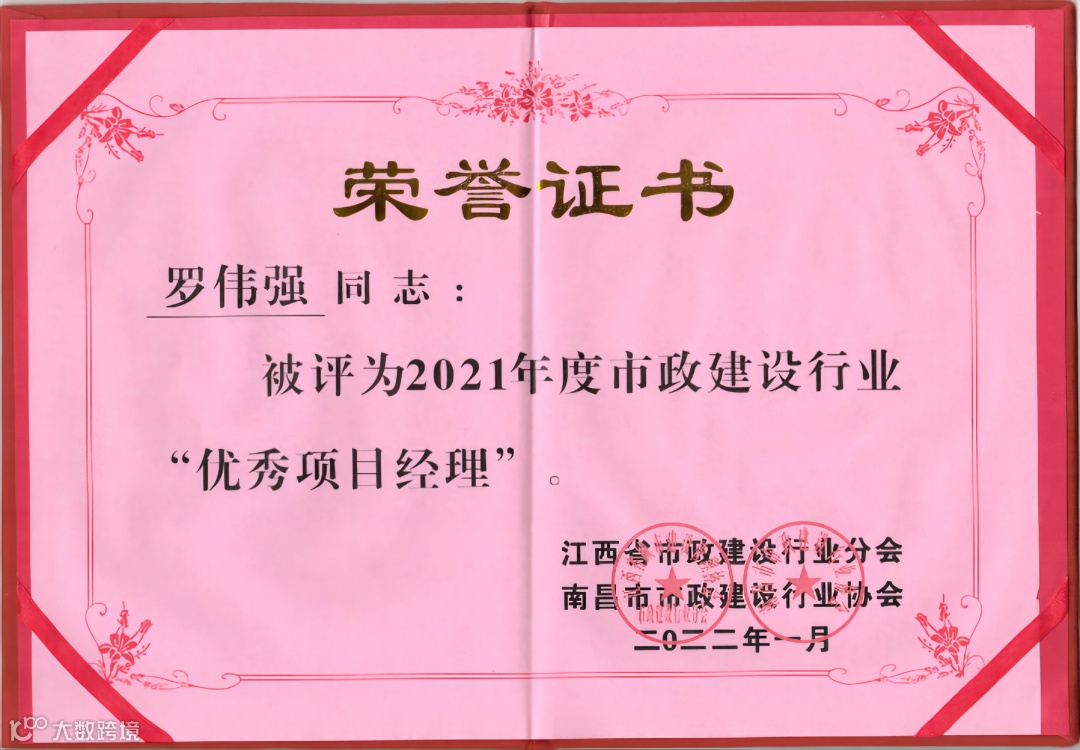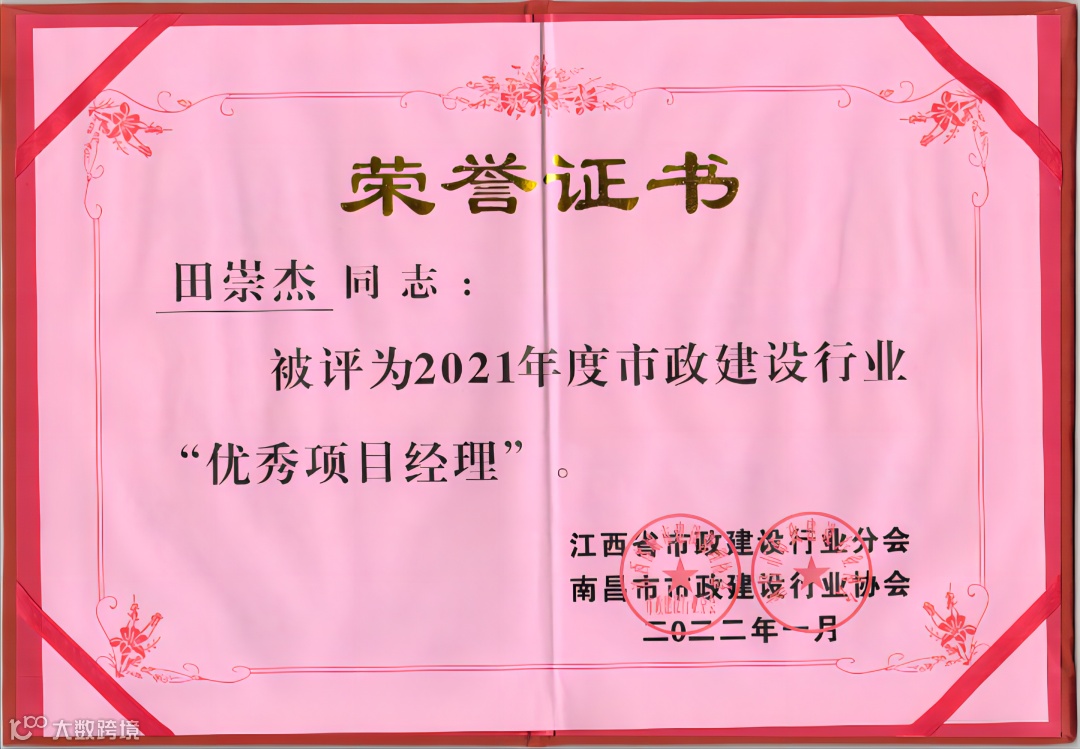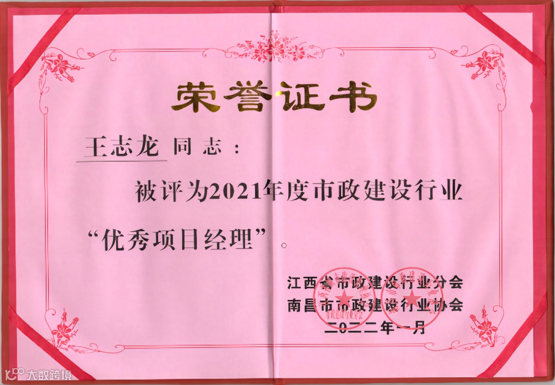 近日,公司参与江西省市政建设行业分会、南昌市市政建设行业协会开展的2021年度市政行业先进单位和市政建设行业优秀项目经理的评选工作中,我公司荣获了“2021年度市政建设行业先进单位”荣誉,公司骨干管理人员中9人获评为“2021年度市政建设行业优秀项目经理”。