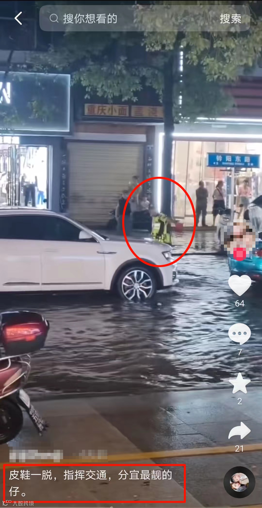 ▲交警分宜大队铁骑队员光脚涉水执勤,群众怒赞“分宜最靓的仔”。