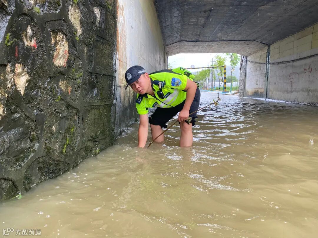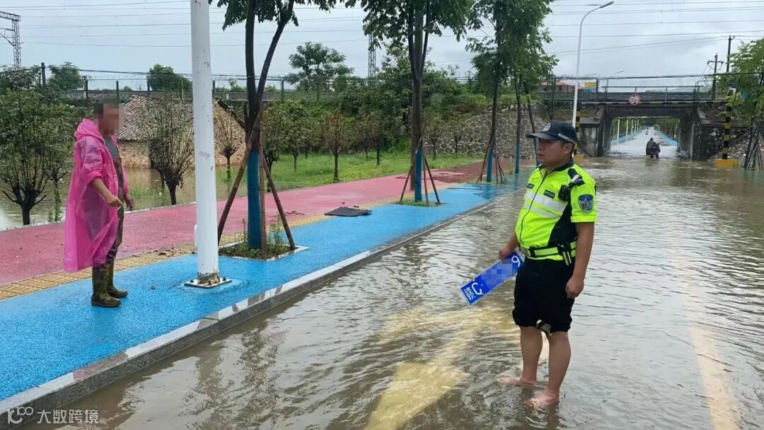 7月23日,暴雨突袭,新余市仙女湖区新欧公路、万商红路口因雨量过大导致部分路面积水。雨情就是警情,交警仙女湖大队民警立即组织警力在积水路段摆放反光警示标志,疏导指挥车辆绕行。