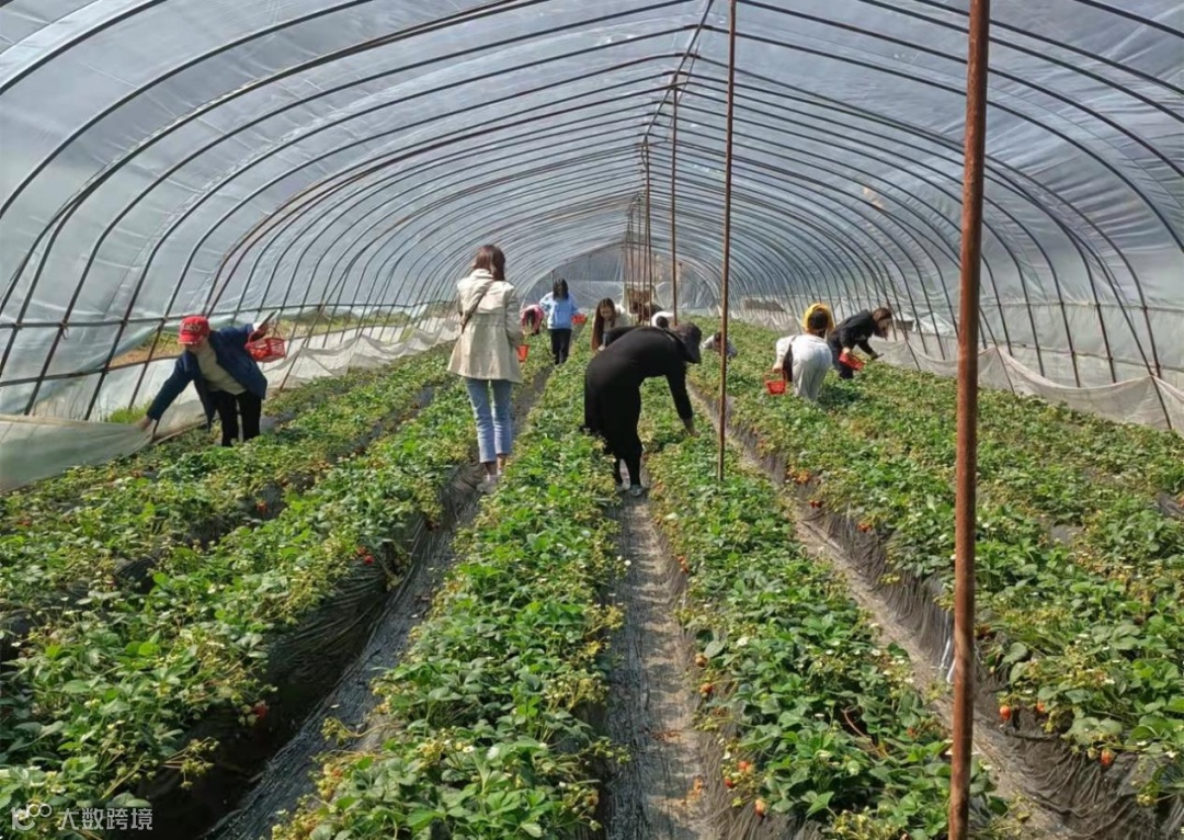 饱览了月亮湾的秀丽景色后,走进草莓采摘园,草莓园里春意浓。一垄垄青翠嫩绿的草莓,点缀着桃花般的朵朵小白花,淡黄、艳红相间的草莓静静地垂挂下来,甚是喜人。真可谓“一抹红艳青垄上,满面桃花笑春风”!走出办公室,来到乡野间,平日里忙碌于家庭与事业的女职工们体会到了难得的轻松与欢快,感受劳作的快乐,分享甜蜜的滋味,草莓园里一片欢声笑语。