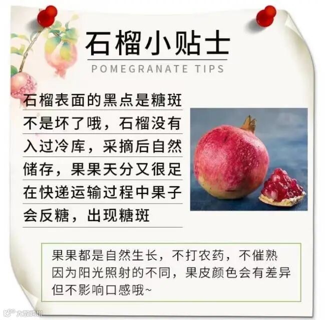 石榴表面的黑点是糖斑不是坏了哦⊙∀⊙!石榴没有入过冷库,采摘后自然储存٩(*´◒`*)۶ 果子天分又很足,在快递运输过程中果子会返糖,就出现糖斑啦(◕ˇ∀ˇ◕)