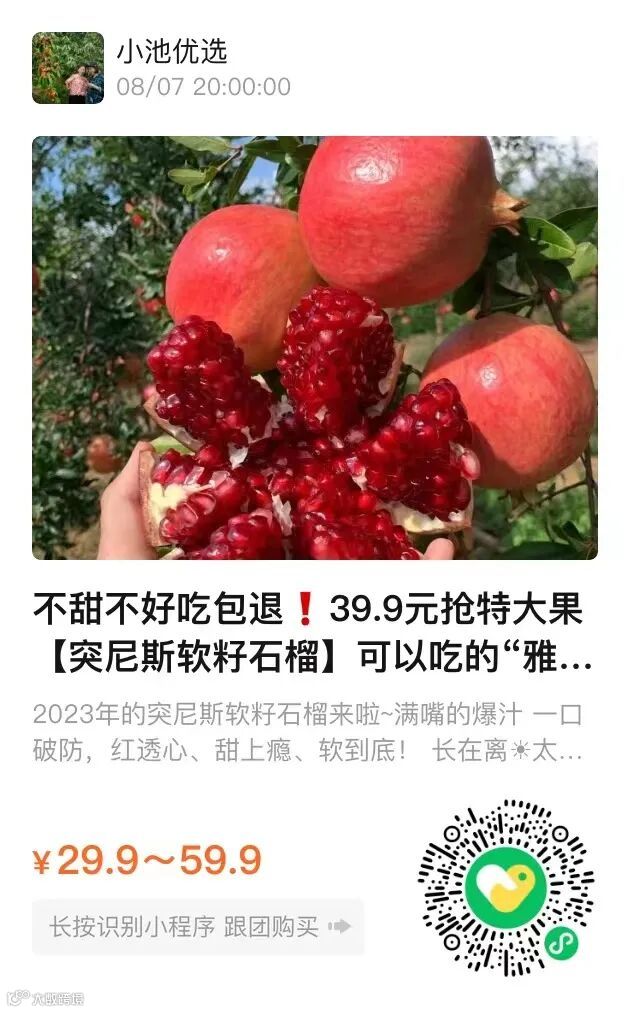 2023年的突尼斯软籽石榴来啦~ 满嘴的爆汁 一口破防,红透心、甜上瘾、软到底!长在离☀太阳最近的地方 沐浴一年的阳光 这一晶抹莹剔透的宝红石如约而至 😋红透得彻的石榴恋,得刻骨爱的情 坠入人间的的突尼斯石榴,大口吃更得劲!💯水分炸裂,捏一下瞬间爆汁,超级超级甜