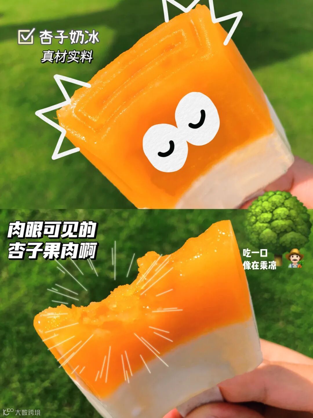 钟薛高杏子奶冰: 🔸杏子大多是6~7月份成熟,金黄色的果实带着少许红晕,挂满枝头,看着就让人欢喜。爬上树摘几颗熟透了的杏子,细软的果肉满溢出甜美的汁水,是童年里关于夏天的快乐回忆。