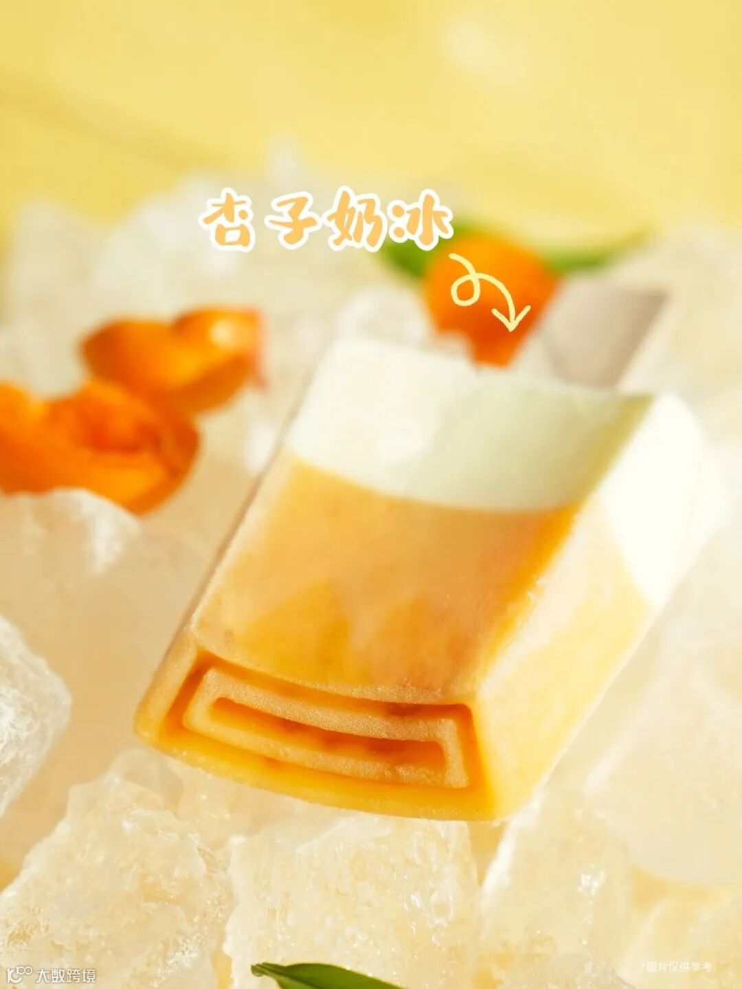 这款杏子奶冰,在上层的杏子冰中,含有真正的杏子果溶果肉(杏速冻果溶含量达到了18%)、杏果丁(蜜饯),你咬上一口,能真实地感受到杏子果肉的质感,口口有料!