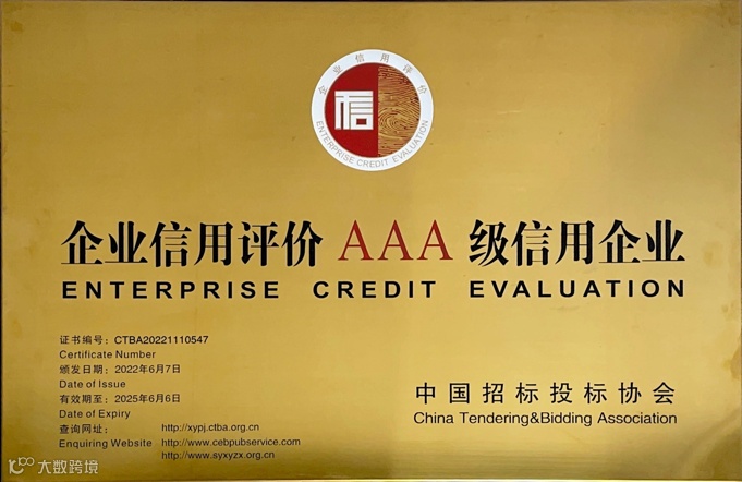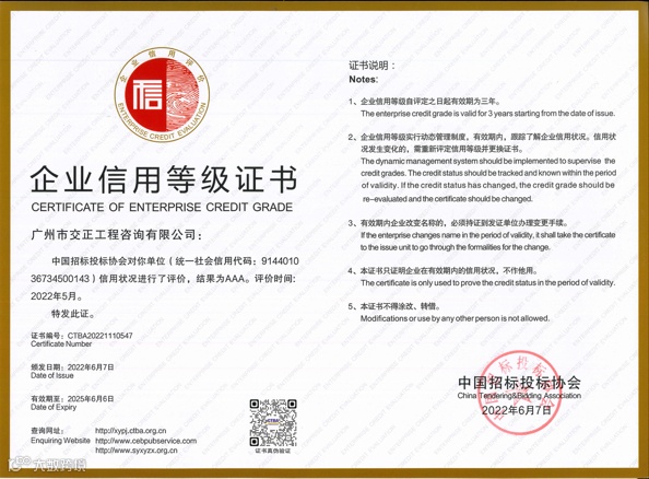 近日,道路研究院交正公司荣获由中国招标投标协会颁发的企业信用最高等级“AAA”级证书,成为2022年度首批获得招标代理机构企业信用评价证书的代理机构之一。
