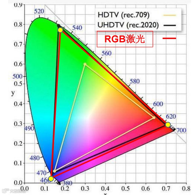 RGB纯激光方案,直接从光源端输出最纯净的三色光,避免了荧光粉转换或滤光片带来的色彩损耗,实现了色域更广、色纯度更高、色彩更稳定的根本优势。