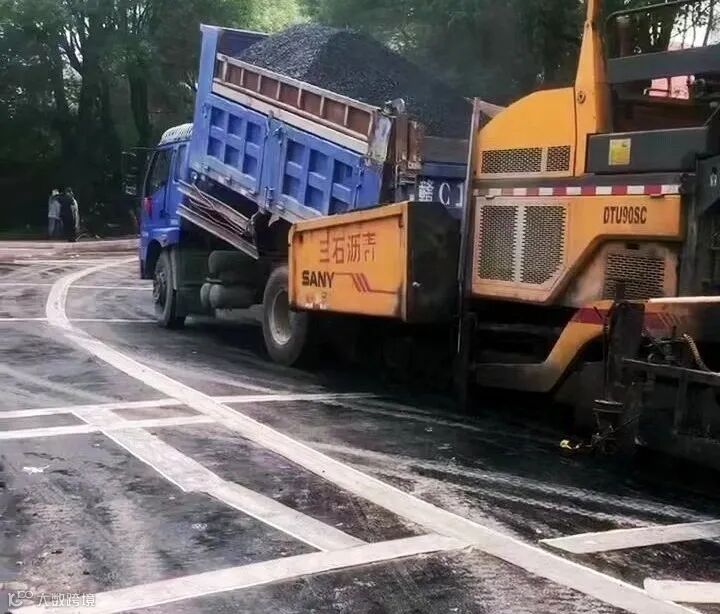 工作人员在对北湖公园南入口路面加铺沥青。