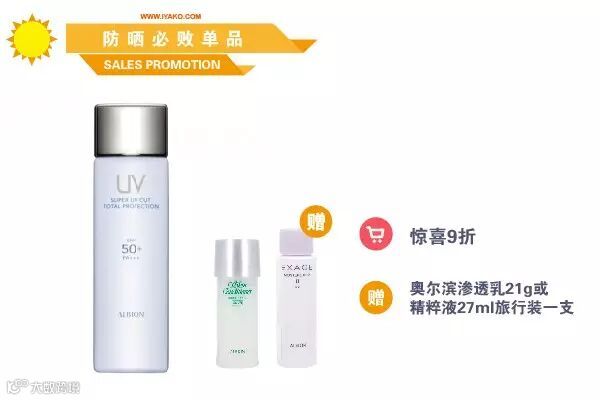 购买奥尔滨防晒系列,惊喜9折,再送渗透乳21g或精粹液27ml一支