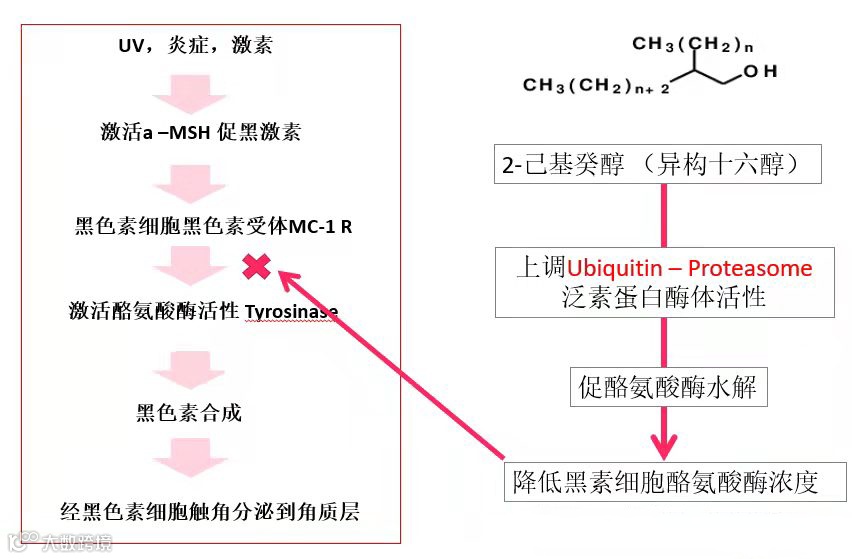 「己基癸醇+积雪草苷+腺苷」,促进酪氨酸酶降解,舒缓泛红,从而抑制黑色素的合成,减少皮肤色素沉着。