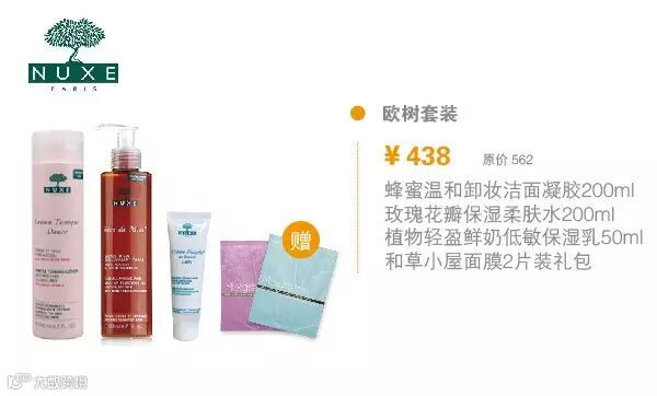 蜂蜜温和卸妆洁面凝胶200ml、玫瑰花瓣保湿柔肤水200ml、植物轻盈鲜奶低敏保湿乳50ml、和草小屋面膜2片装礼包 原价:562元 特价:438元