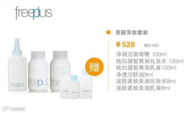 净润洁面啫喱100ml、纯白凝皙爽润化妆水 130ml、纯白凝皙爽润乳液100ml、净透洁肤油9ml、滋肤紧致柔润化妆水8ml、滋肤紧致柔润乳液8ml原价:620元 特价528元/组