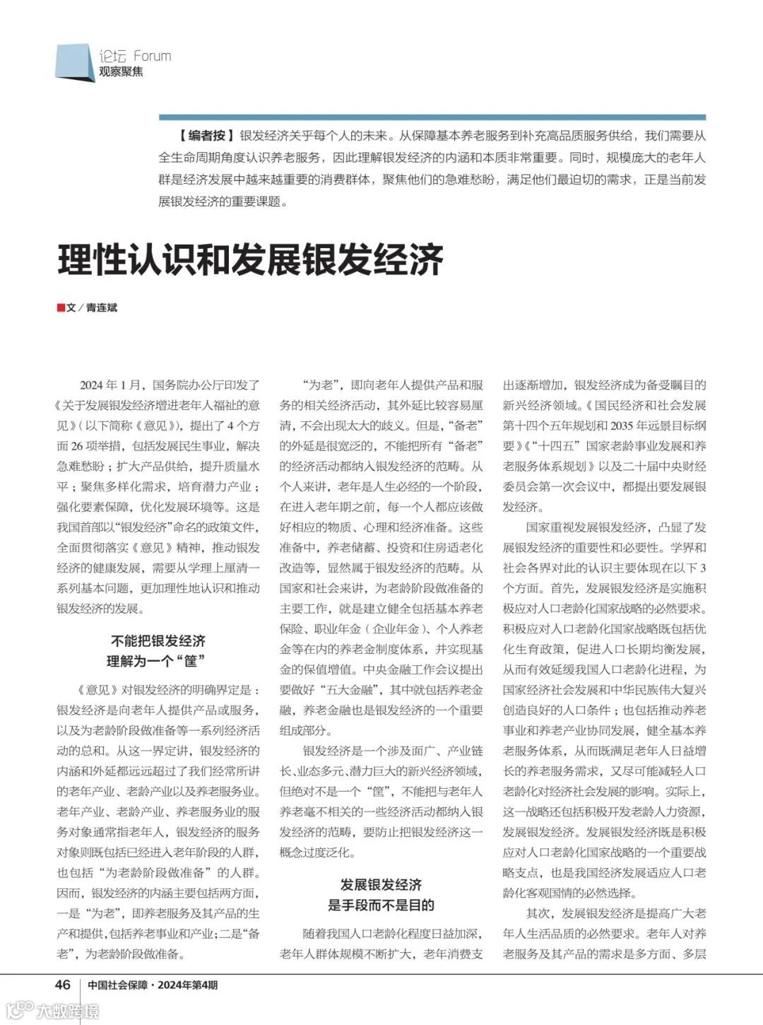 2024年1月,国务院办公厅印发了《关于发展银发经济增进老年人福祉的意见》(以下简称《意见》),提出了4个方面26项举措,包括发展民生事业,解决急难愁盼;扩大产品供给,提升质量水平;聚焦多样化需求,培育潜力产业;强化要素保障,优化发展环境等。这是我国首部以“银发经济”命名的政策文件,全面贯彻落实《意见》精神,推动银发经济的健康发展,需要从学理上厘清一系列基本问题,更加理性地认识和推动银发经济的发展。