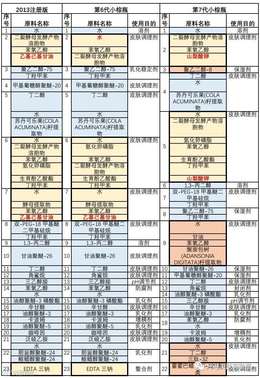 雅诗兰黛的第7代小棕瓶在7月29正式发售,作为一款从1982年诞生的第一瓶夜间精华Night Repair开始,历经六代更迭的明星单品,成为万人追捧的Advanced Night Repair经典王牌,每一代新品的上市都会成为行业关注的焦点。出于对经典的致敬,以及技术研发和成份分析的乐趣,我们来探讨一下全新第7代的雅诗兰黛小棕瓶,看看有哪些变化和亮点。图片来源:www.esteelauder.com.cn官网价:640元/30ml;900元/50ml 第7代小棕瓶发布后,产品介绍的通稿遍布了很多美妆的网站,这里就不再详述,感兴趣的朋友可以很轻易就检索到。第7代小棕瓶的注册名称为“特润修护肌活精华露”,与第6代小棕瓶“特润修护肌透精华露”有一个字的变化。备案的编号为:国妆网备进字(沪)2020003600,原地产地为:英国、美国、比利时。信息来源:国家药品监督管理局 深扒雅诗兰黛在药监局注册的信息,结合2013注册版(不知道算第几代)和第6代的配方成分,我们发现第7代的小棕瓶还是有不少的变化,有好几个亮点,具体的变化已经用颜色进行区分。信息来源:国家药品监督管理局在配方成分中,第7代比第6代增加:聚乙二醇-8、猴面包树籽提取物、三肽-32、霍霍巴蜡PEG-120酯类;另外原有的几个成分也有轻微的变化:二裂酵母发酵产物溶胞的防腐剂增加“山梨酸钾”、EDTA三钠更新为“EDTA四钠、EDTA二钠”的组合物。相比第6代小棕瓶,配方成分删除了“甲氧基肉桂酸乙基己酯”和“紫松果菊提取物”。相对比2013版和第6代变化不少,增添2大亮点,第7代小棕瓶加入了2大活性成分“猴面包树籽提取物”和 “三肽-32”;还增加了聚乙二醇-8和霍霍巴蜡PEG-120酯类,提升小棕瓶的保湿性和滋润感,诚意满满。 接下来的内容,我们再详细认识一下新增的2大活性成分“猴面包树籽提取物”和 “三肽-32”。第7代小棕瓶强调了“守护细胞昼夜节律”,支持皮肤自我更新的天然同步,优化调节皮肤的自然昼夜节律。也可以理解为,即使你在加班、熬夜、刷手机、打游戏等不规律的作息下,第7代小棕瓶可以尽可能地维持皮肤的昼夜节律时钟(Circadian clock) 。皮肤的昼夜节律变化图片来源:Biological Rhythms in the Skin 三肽-32(Tripeptide-32)首次在国内版的第7代小棕瓶中加入该成分。人体的肌肤细胞也是有生物钟的,白天比较活跃,晚上活性会下降。三肽-32可模拟褪黑素的分子结构,调节肌肤生物钟。即使你的作息打乱了,三肽-32依然可以维持肌肤正常的节律,防止肌肤老化,保证肌肤处于健康状态,尤其适合那些作息不规律、喜欢熬夜、刷屏的朋友。 第二大亮点的是运用了表观遗传学的研究成果,表现遗传学(Epigenetics)是一门相对于传统遗传学延伸的新型研究热题。miRNAs是细胞生长、分化、凋亡和免疫应答等多种细胞过程中很重要的调节因子,是目前国内外研究的热点与亮点。皮肤细胞中有一种关键因子“miR-146A”——雅诗兰黛称为“信源因子”,MicroRNA-146A参与体内的多种生物学过程,内源性的衰老和UV损伤都会使miR-146A显著下调。第7代小棕瓶加入的黑科技是Ashland公司的PhytoRNx Baobab(水、甘油、水解猴面包树(ADANSONIA DIGITATA)提取物),一种独特的猴面包树提取物,富含植物小分子核糖核酸(RNA),有助于促进老化肌肤重建平衡状态,有助于维持皮肤中多种miRNA功能的关键蛋白调节因子的稳态表达,提高细胞中的miR-146A的活力,更快地激活肌肤的新生和胶原合成,帮助快速提升皮肤的自我修复,并促进皮肤细胞新生。图片来源:Ashland公司的PhytoRNx Baobab 总体来说,第7代小棕瓶在原有【二裂酵母发酵产物溶胞物】为主的体系上的再次升级,虽然改动的幅度不大,删减掉越显鸡肋的“甲氧基肉桂酸乙基己酯”和“紫松果菊提取物”,加入凝聚近十多年来的表观遗传学的研究成果,提升内在,更加符合现代人生活节奏所需的“昼夜节律调控”所需。 参考文献:Mary M , Edward P , Kelly D , et al. Biological Rhythms in the Skin[J]. International Journal of Molecular ences, 2016, 17(6):801.薛竞. miRNAs对人皮肤成纤维细胞光老化的作用及其相关机制[J]. 中国老年学杂志, 2017(2).吴慧, 范恒, 刘星星. MicroRNA-146a生物学作用的研究进展[J]. 世界华人消化杂志, 2019(18).华丽娟. MicroRNA146a在UVB诱导的急性光损伤中作用机制的研究[D]. 南京医科大学, 2011. 文章推荐壬二酸——被低估的祛痘控油美白全能成分 3个秘诀,让护肤品高效吸收! 三十而已,这些成分可以轻松应对眼部问题