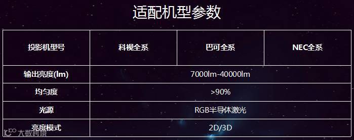RGB三色纯激光光源可通过光源密堆积耦合技术,轻松达到10000-100000流明,适配各类型放映机