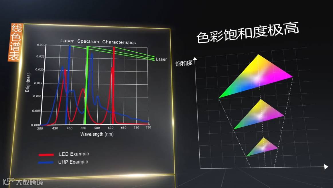 RGB三色纯激光光源覆盖色域是NTSC标准的2倍、DCI标准的1.57倍,覆盖人眼所见颜色90%以上,达到Rec.2020标准。且RGB激光显示技术以RGB三原色为基础,其光源的谱线极窄,因此其显示的颜色饱和度就越高,视觉上颜色的纯净度和通透性就越好。