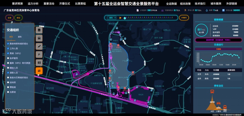 广交研以技术创新为核,在仿真评估基础上,开发了第十五届全运会交通保障技术支撑平台,推动开幕式交通保障相关工作数字化、集成化、可视化;
