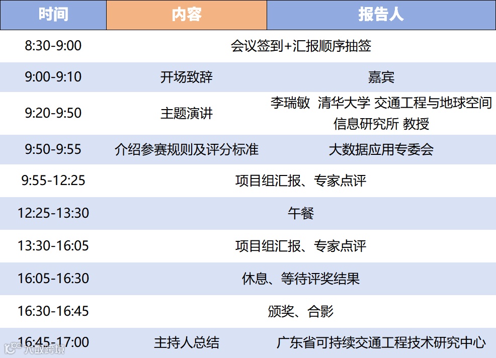 本次赛事将于12月23日(周二)9:00-17:00在广交研612会议室(广卫路10号西侧)举行最终评审,具体安排见下表。