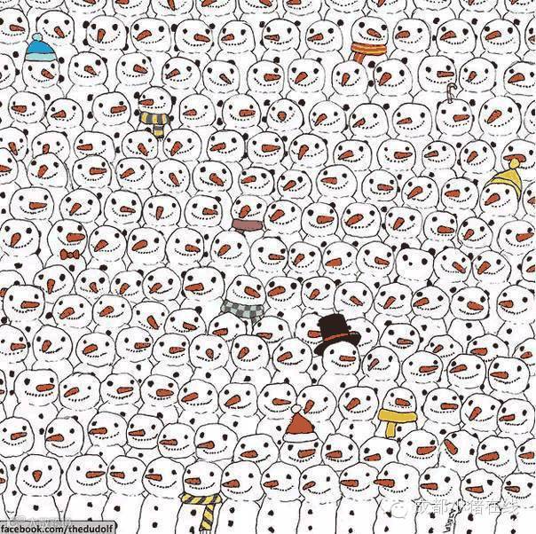 雪人:我们里面混进了一只熊猫!这是最近网上最红的一张照片,来自匈牙利画家Gergely Dudas,不到10天已得10万次转发。外国网友表示,确实不太好找 有人找了15分钟你能找到熊猫么?
