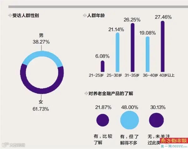 填写问卷的人群中,女性群体占总调研对象的61.73%,而21-40岁年龄阶段的人群占72.54%。有多少人了解过相关养老金融产品?从问卷调查结果来看,有69.87%问卷参与者表示有了解过此类产品,30.13%的受访者则表示从未关注过。不过南都湾财社记者发现,在了解过相关产品的人群中,仅21.87%的人认为自身对养老金融产品比较了解,而48%的人表示虽然有了解过,但了解得不多。