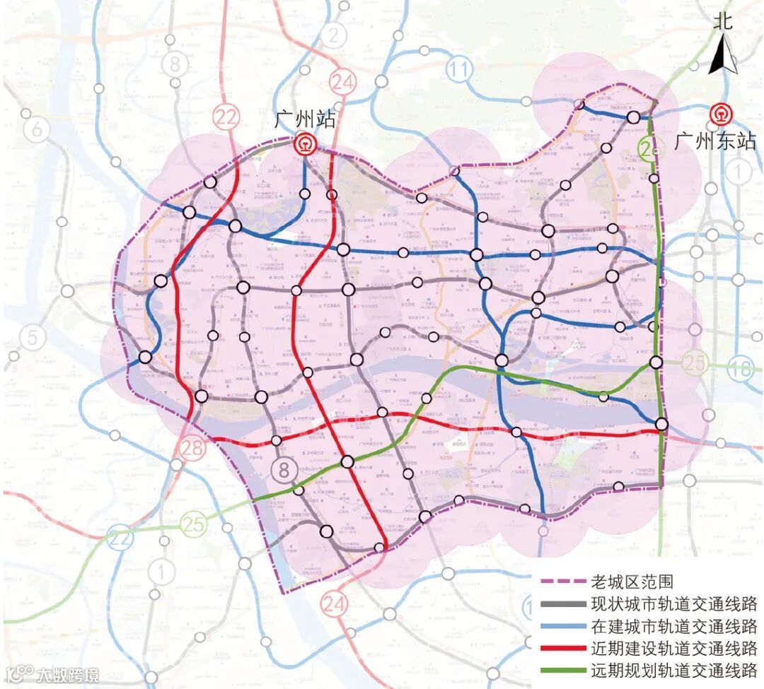 广州市自2010年以来持续疏解老城区人口和部分职能,已取得了一定效果:近10年广州市常住人口增长约600万人,老城区人口反降32万人(见图3);通过逐步在外围区新建重点医院、学校等的分支机构,疏解老城区过度集中的服务功能。老城区已建成5条城市轨道交通线路,车站800 m覆盖率达到86%。根据《广州市城市交通发展战略规划(2019—2035年)》部署[7],将优先建设老城区内城市轨道交通线路,至2025年建成8条、2035年建成10条,基本实现城市轨道交通车站100%覆盖(见图4),通过持续优化交通结构,率先实现绿色出行比例达到90%。