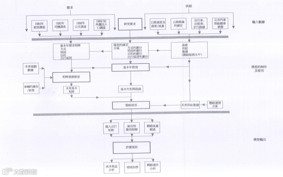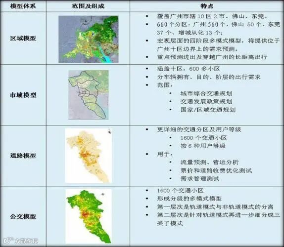第三代交通模型立足于大数据时代发展特点,基于采集的传统数据、道路交通信息数据(公交信息数据、高速公路网收费数据、市域卡口检测数据等)、手机信令和互联网位置数据,构建了全态势感知的数据底盘;为适应粤港澳大湾区分析需要,将模型范围进一步扩展为省域、同城化区域(广佛莞)、市域三个层次,适应综合运输模式下的区域交通分析。