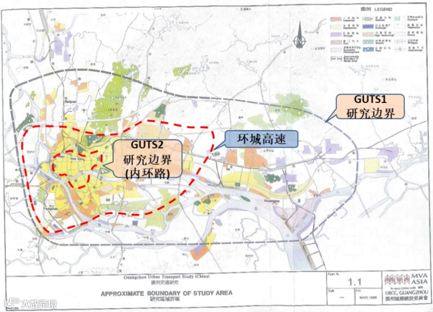1984年广州市开展了第一次居民出行调查,随后在20世纪90年代,为应对机动化浪潮下的道路交通拥堵,广州在世界银行资助下先后开展了“广州市交通研究”(GUTS1)、广州市中心区交通改善实施方案(GUTS2),以广交研为研发主体,通过合作引进了国际先进的交通模型技术手段——交通战略模型START和道路分配模型TRIPS。为迎接“九运会”、树立现代化城市形象,1998年广州确立“一年一小变,三年一中变”工作目标,由此推动了城市高快速路体系建设,特别是构建内环路、环城高速,以及二条环线间的七条放射线路网骨架,奠定了广州市中心城区主骨架路网基础。