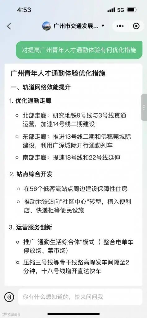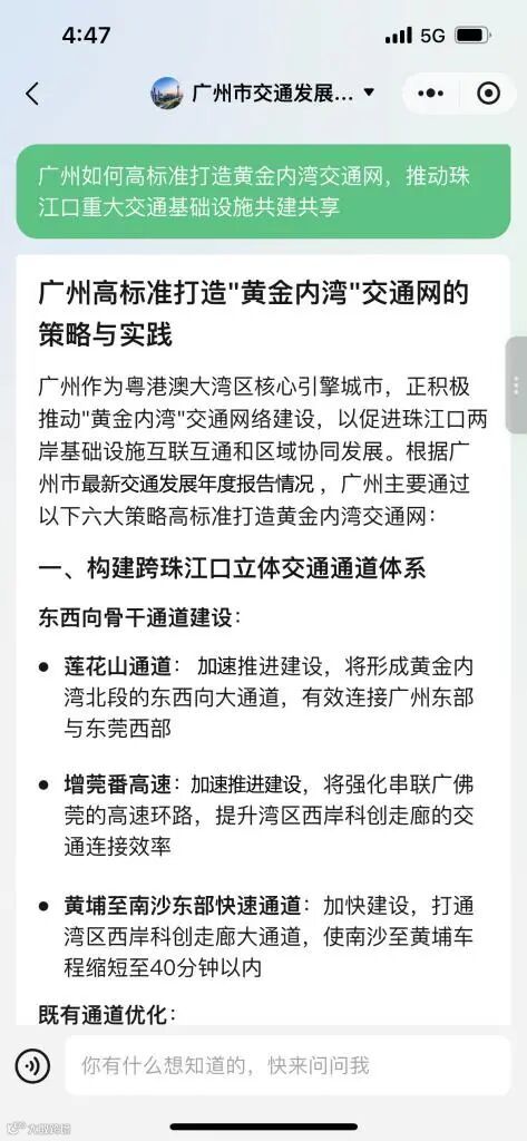 结合人工智能的发展趋势,从专业知识库搜索、报告智能生成、时空大数据与规划智能问答等方面加强融合AI大模型的交通模型多场景应用。通过强化大语言模型应用的本地化部署,结合城市专业资料完成微调训练,实现提高业务工作效率,为交通规划、管理提供标准化、便捷化信息支撑。目前广交研已经开发完成交通年报AI大模型,将DeepSeek等大语言模型的“思考力”与交通年报丰富的“数据力”充分融合,在充分分析数据变化趋势的基础上,梳理规律、总结问题并提出对策,智能化支撑决策场景。