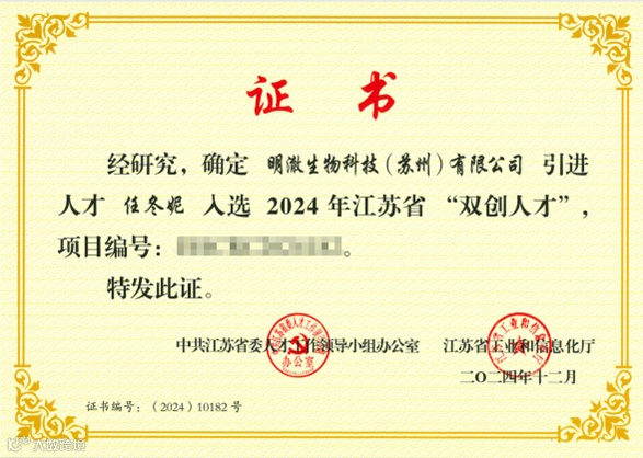 近日,经中共江苏省委人才工作领导小组办公室、江苏省工业和信息化厅的多轮评审,2024年江苏省“双创计划”结果已公布。明澈生物科技(苏州)有限公司创始人兼董事长任冬妮博士成功入选2024年江苏省“双创人才”。