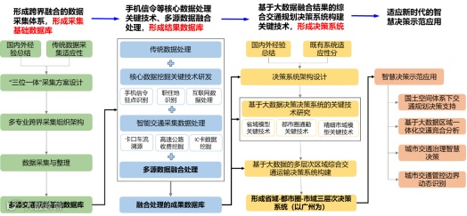 以多源数据融合技术支持下的交通规划决策模型平台为基础,深度匹配国家区域和交通强国战略、存量发展和精准治理诉求,广泛采集涵盖人、车、地静态和动态出行数据,持续从模型拓展、交通决策技术提升、决策应用等方面进行探索性研究,研发形成了基于手机信令数据的省域客流特征识别、基于城市引力的区域客运交通需求预测、基于腹地理论的枢纽群竞合分析、基于都市圈轨道交通一体化的客流预测技术等4项区域交通规划决策技术,以及常发性拥堵点识别和基于车流溯源的拥堵治理、基于感知数据的城市交通一体化动态交通仿真、基于闸机刷卡数据的轨道站点客流效益识别3项城市交通空间治理技术,集成整合为第三代区域综合交通运输规划决策支持平台。