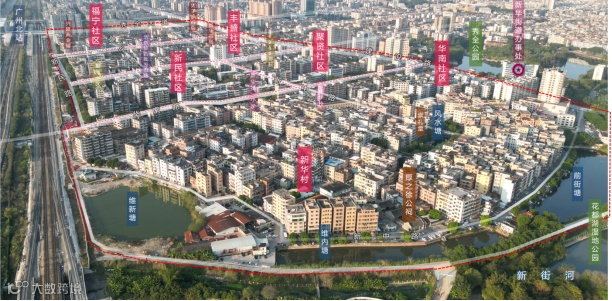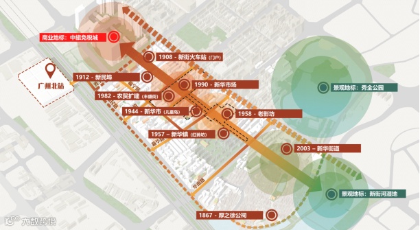 结合城市发展重点,打造老城记忆轴线,南北串联重塑老城市新格局。片区链接广州北站、中旅免税城、花都湖湿地公园“站城园”三大区块,联动市场、影院、新华村、城镇社区“市影村社”四大功能区,梳理片区内历史人文资源,联合城市发展,重塑城市空间结构,新旧资源组成合力推动城市有机更新。