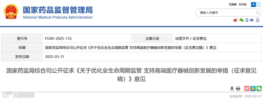 🔹 3月31日,国家药监局发布《关于优化全生命周期监管 支持高端医疗器械创新发展的举措(征求意见稿)》(以下简称《举措》),通过完善审评审批机制,加强高端医疗器械重大创新的全生命周期监管。