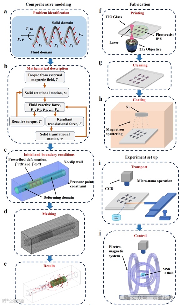 基于考虑血管内螺旋微/纳米机器人(MNRs)的临床使用场景,提出了一种适用于一般或非标准螺旋状MNRs的高精度动态模型,也适用于特殊或标准的螺旋状MNRs。该模型基于MNRs的运动状态和行为与血液介质的流动状态和行为相互影响而建立,这个理论被称为流固相互作用理论(FSI)。FSI理论相比上文提到的RFT模型,天然地消除了螺旋形状限制、流体相互作用限制等假设,提升了对MNRs行为预测的准确性。