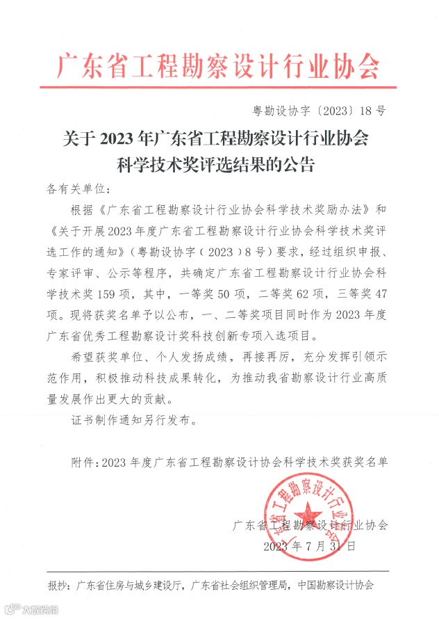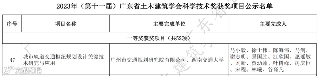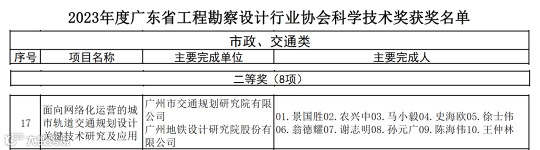 2023年度广东省土木建筑学会科学技术奖、广东省工程勘察设计行业协会科学技术奖评选结果已于近日公布。我院牵头完成的《城市轨道交通枢纽规划设计关键技术研究与应用》荣获广东省土木建筑学会科学技术一等奖,《面向网络化运营的城市轨道交通规划设计关键技术研究及应用》荣获广东省工程勘察设计行业协会科学技术二等奖。