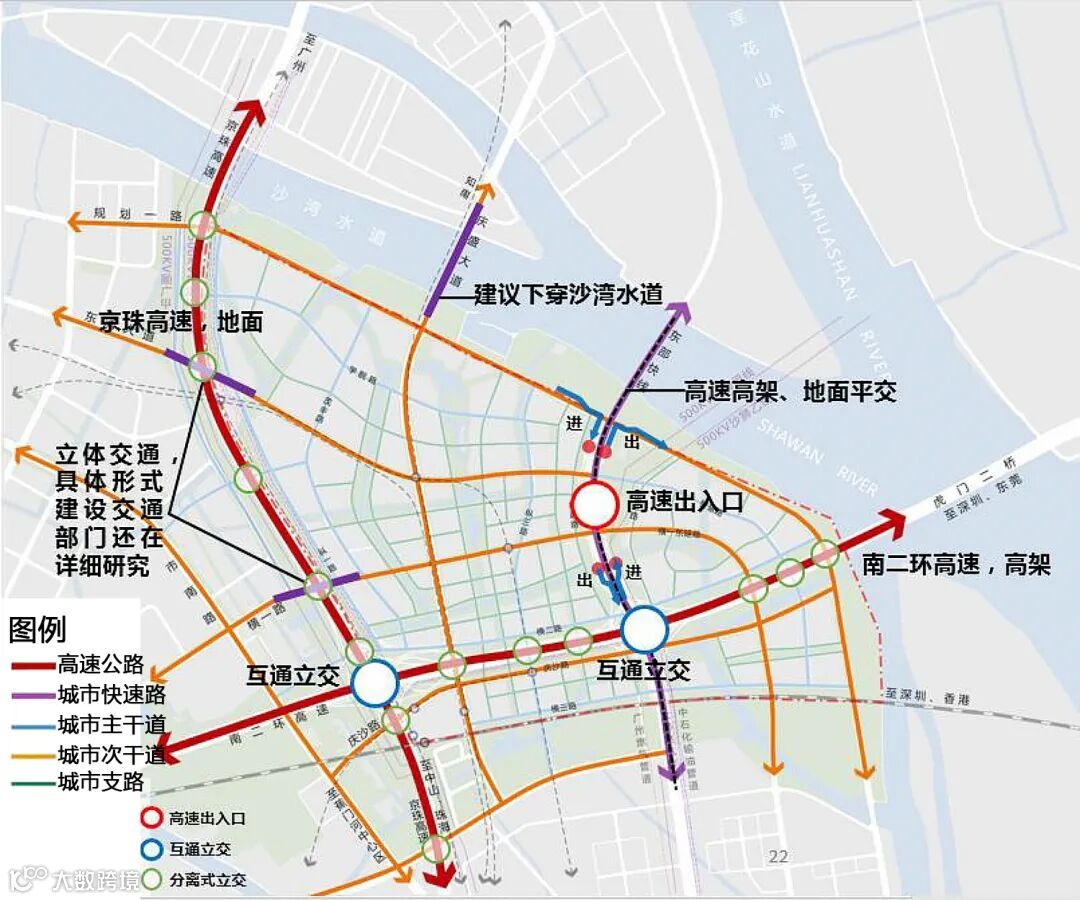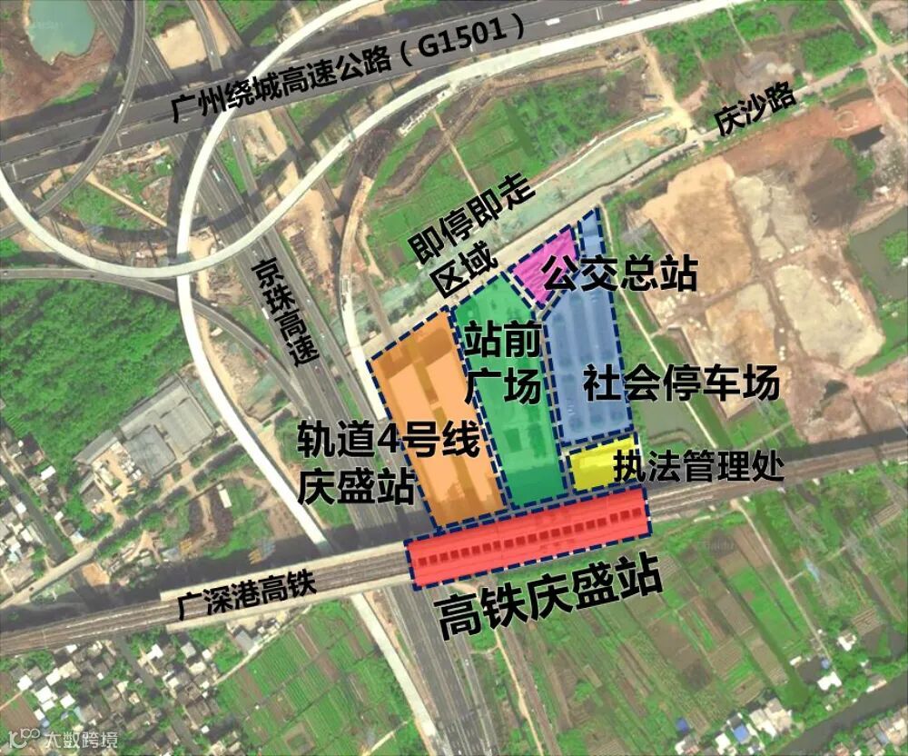 首先,规划立交过于密集,占用用地面积大,立交群功能亟待优化整合。庆盛区块及周边规划了密集的多个立交,且转向功能普遍较全,未统筹考虑立交系统的布设,占用城市建设用地面积资源过大。需要进行优化整合。其次,内部路网密度不足,街区尺度过大,与庆盛区块功能定位不符。庆盛区块定位为新兴产业、枢纽商贸、综合服务功能,内部出行宜以公共交通、绿色出行为主,既有规划街区尺度过大,对慢行交通不甚友好。现状枢纽周边主次干道路网基本处于空白状态,道路交通的可达性较差。再者,高速、铁路、水系切割区块用地,跨京珠高速道路近期实施难度大目前庆盛区块规划有京珠高速、东部干线高速、南二环高速、广深港高铁,加上输油输气管线及沙湾水道,形成“孤岛”切割了庆盛区块与周边配套功能区的联系,也对区块内部东、西分区的横向联系产生一定切割作用。最后,庆盛枢纽衔接多条轨道交通,用地条件复杂,站点保护范围尚不明确庆盛枢纽衔接3条城市轨道1条高铁,用地规划条件较为复杂,对城市轨道交通站点的保护区范围尚不明确。