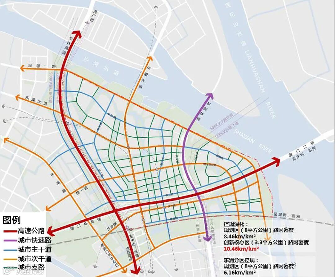 作为地处湾区几何中心的南沙来说,内外交通的衔接,尤其要关注面向湾区东岸的对外交通的衔接。目前该片区规划有3条高速路的重点节点,包括1个高速出入口、2个互通立交。东涌大道、横一路穿越京珠高速的桥梁、隧道和半隧道,内外交通能否合理衔接,是本次规划方案提升的重要工作。建议重点衔接好内外交通,减少穿越性交通的分割影响。重点完善内部路网格局,深化的主干路网道路规划为“四横三纵”,其中四横包括规划一路、东涌大道、横一路、庆沙路;三纵包括市南路、庆盛大道、东部干线地面路。高标准空中路网密度,路网密度控制在8.5km/km2左右(见图 8)。