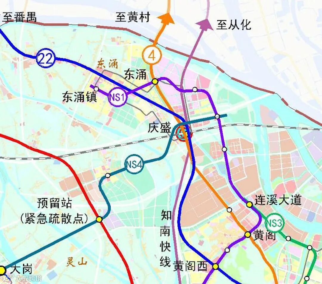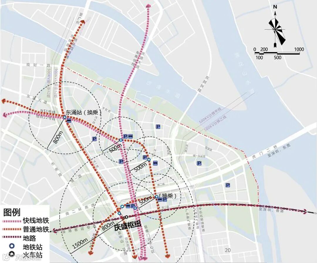 根据自贸区南沙片区综合交通提升规划,庆盛枢纽周边的过境通道将形成由京珠高速和南二环高速组成的“十字”路网格局。城市交通性通道由鱼黄支线和东部干线组成。城市生活性主干道主要有市南路、谭东大道、金光大道、庆盛大道(石化大道)、明兴大道等。根据既有控规和自贸区南沙片区综合交通提升规划等规划,庆盛枢纽周边主要有6处立交节点,其中京珠高速沿线有2 处,分别是东涌互通立交和黄阁立交,东部干线沿线有 4处,分别是东涌大道立交、虎门二桥立交、鱼窝头大道立交和鱼黄支线立交(见图5)。根据既有控规和自贸区南沙片区综合交通提升规划等规划,规划共有6条轨道交通线路在庆盛枢纽设站,其中国家铁路1条,城市轨道 5 条,分别是广深港高铁、轨道4号线、22号线、知南快线、NS1线、NS4线(见图6)。