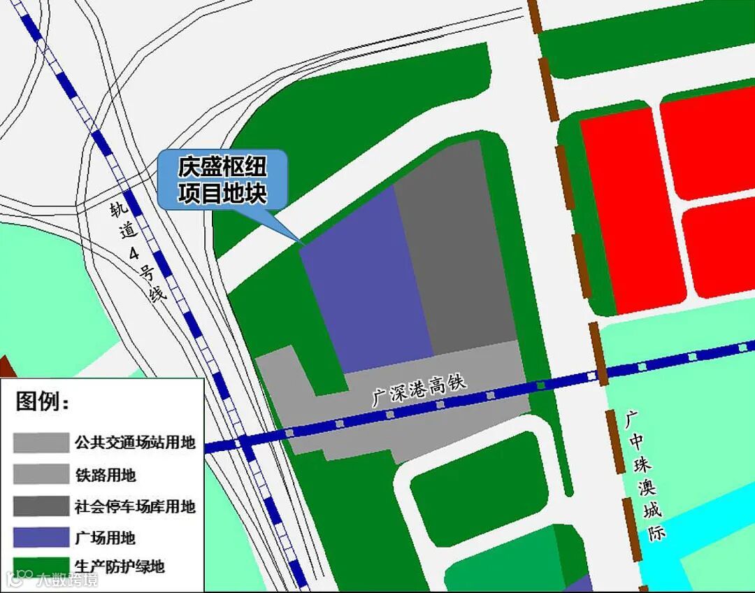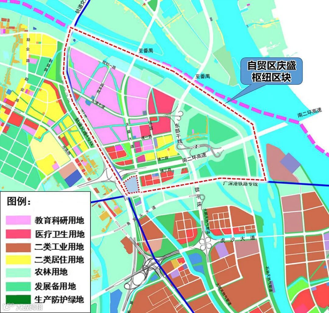 根据南沙区现行控规:一、庆盛枢纽项目地块范围约 0.98平方公里 ,项目地块内部主要有公共交通场站用地、铁路用地、社会停车场库用地、广场用地和生产防护绿地,庆盛大道东侧有商业开发用地(见图 3);二、庆盛枢纽区块北至沙湾水道,南至广深港高铁,西至京珠高速,东至小虎沥,共 8平方公里 。区块内部东部干线以西大部分为教育科研、医疗卫生用地,有一定量的商业用地和二类居住用地,东部干线以东为居住和科研设计用地;三、庆盛枢纽周边地区大部分为农林用地和工业用地,其中广深港高铁以北主要是教育科研用地和二类居住用地,还有少量发展备用地和商业用地,广深港高铁以南以二类工业用地和农林用地为主,还有少量商业用地(见图 4),从现行规划来看,枢纽项目用地主要为公共交通场站用地、铁路用地,与周边的开发一定程度上缺乏一体化开发。