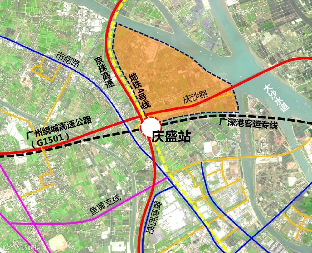 现有研究形成了颇有价值的成果。但是,多数文献主要从单个交通设施角度讨论交通枢纽的规范,关于湾区层面的交通枢纽研究较少 [8]、忽略了讨论粤港澳大湾区内交通枢纽规划提升方案 [9]。粤港澳大湾区的建设有着重要的战略作用,能够有效地打造国际一流湾区和世界级城市群、带动泛珠三角区域的发展;并且有利于深化“一带一路”的战略,形成全面开放的格局 [10]。而广州市南沙区作为粤港澳大湾区战略枢纽,其交通枢纽发展状况影响到粤港澳大湾区城市融合程度。因此,基于粤港澳一体化,剖析南沙交通枢纽的规划细则是有意义的。综上所述,本文以南沙庆盛枢纽为例,首先剖析庆盛枢纽片区建设现状及问题;其次,提出庆盛枢纽片区规划提升方案,以期为相关政府部门制定交通枢纽建设政策提供依据。