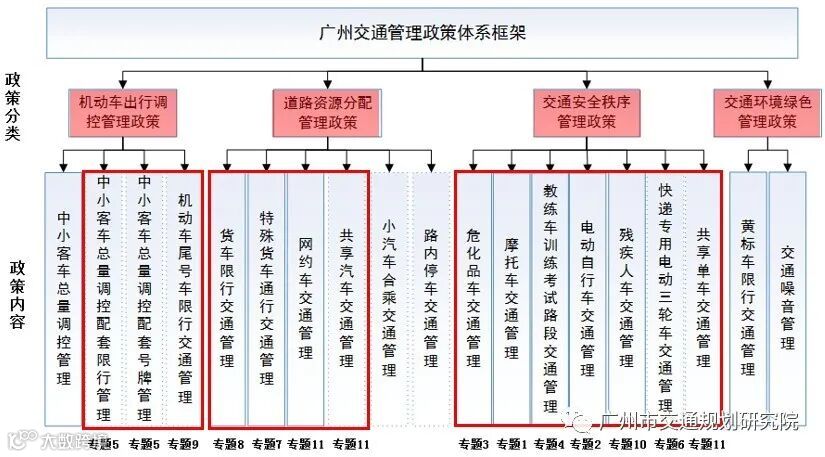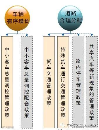 (二)首次在广州提出构建政策平台,融合现有的通行管控政策,形成机动车出行调控管理政策、道路资源合理分配管理政策、交通安全秩序管理政策、交通环境绿色管理政策四大政策体系,共19项政策。