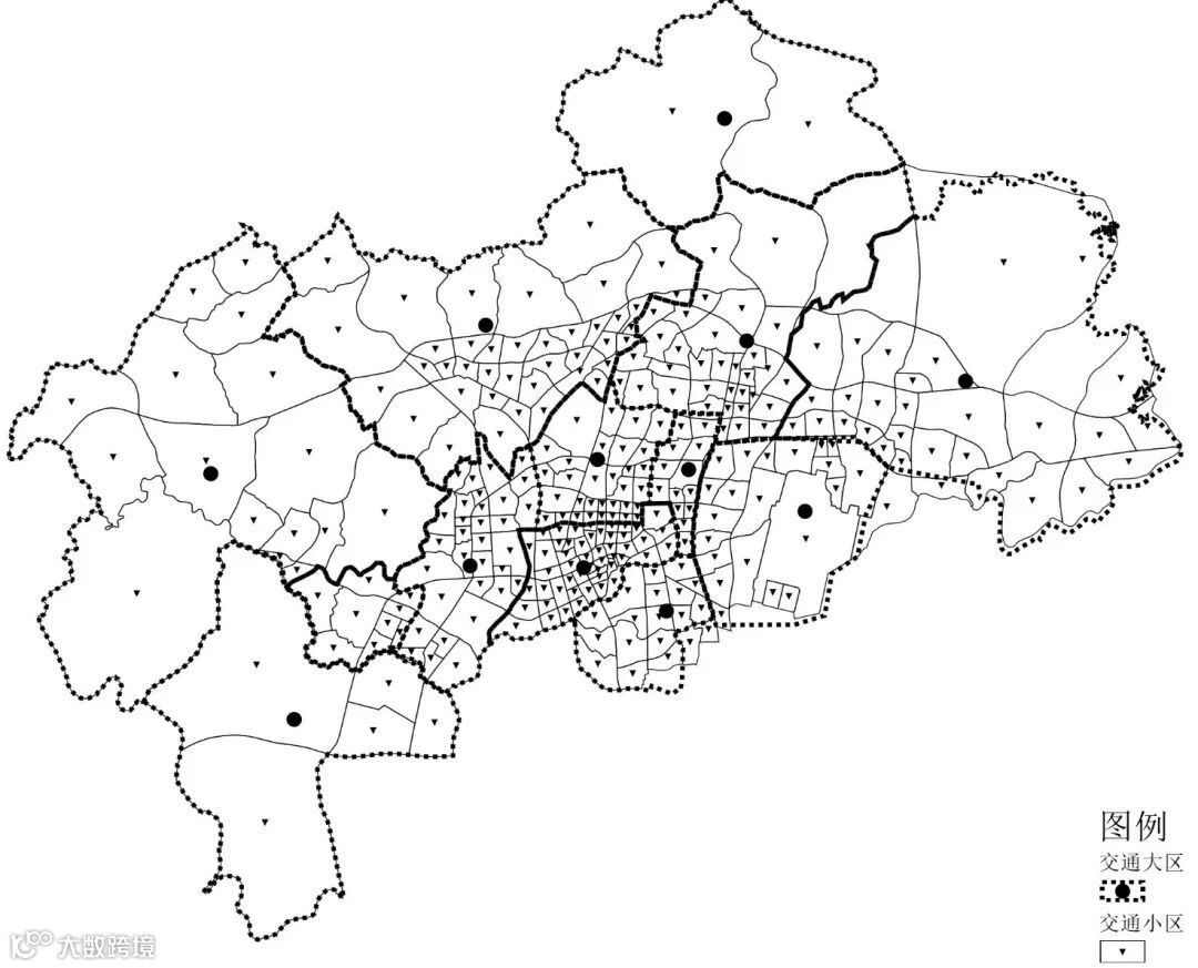 广州市花都区面积970平方公里,2018年末常住人口109万,管理人口155万,从业人口70万(其中区内就业人口63.6万),就业岗位约79.6万,道路网络长度约2397公里。结合行政边界、水系、交通网络和土地利用等条件,共划分交通小区304个,交通大区12个,用于交通方案分析和测试。利用移动通信位置数据分析的职住联系矩阵作为基准情形和输入条件,假定其为已知正确出行OD矩阵,利用其特征,对传统出行分布模型进行标定和校验,以验证传统模型对出行者活动稳定性解释的不足。
