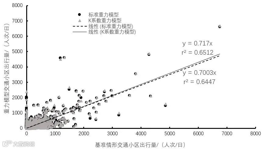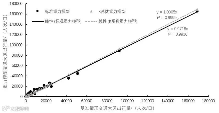 以基准情形为参照,对应全部12个交通大区144个OD点对的计算结果,标准重力模型和K系数重力模型的模拟结果在交通大区层面均能较好地拟合,拟合优度达到0.99以上。。