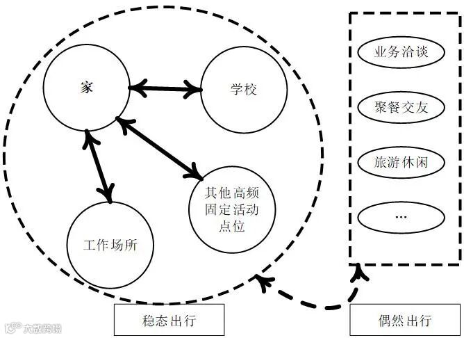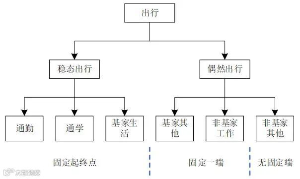 传统四步骤模型中出行目的主要分为基家出行和非基家出行两大类,具体可以细化为基家工作、基家上学、基家生活和基家其它、非基家工作与非基家其他等六类,或者其他类似划分方式,强调的是出行目的和出行一端性质的稳定性,而另一端则依赖满足条件的最优化选择求解,相当于每进行一次求解进行了一次洗牌,无法体现出行者的稳定性属性。新的出行目的划分更强调对出行者社会属性稳定性的利用,包括住所、工作场所、学校及日常生活驻点的稳定性,充分响应了出行者自身的客观可能活动范围,而不是传统的最优化求解方法,更加能够符合城市实际。