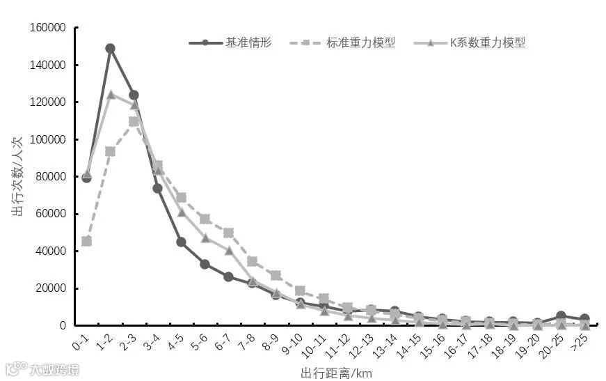 从出行距离分布和交通大区出行联系来看,所建立所标定的模型已经具有非常高的精度,能够比较准确地反映城市的出行特征。但从交通小区层面来看,标准重力模型和K系数重力模型计算结果和基准情形的拟合优度均不到0.65,甚至存在OD点对之间实际出行需求为0、但有较大预测值的情形。这也说明了传统基于数学规划的出行分布预测方法能够在一定程度上实现预测的要求,但在小颗粒度分析上容易存在偏差,而且这是在具有比较高精度的出行距离分布和大区出行联系的基础上完成的。