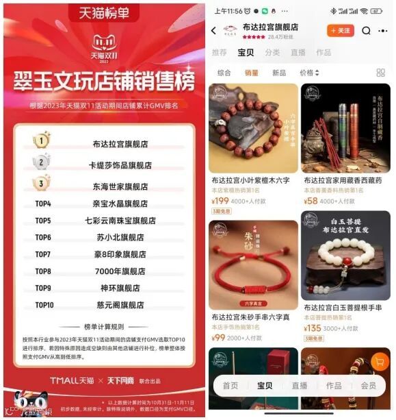在2023年天猫双十一的翠玉文玩销售榜单中,布达拉宫旗舰店位居前列,其热销产品为价格低于200元的木质珠串,正是25岁以下消费者偏爱的商品。从产品的材质和款式来看,布达拉宫旗舰店的相关产品并不具备显著的外观特征,但其IP效应所附带的“福运”属性和神秘色彩与年轻群体日益青睐祈福文化的趋势相契合,对他们而言,购买手串的消费意义更多在于对产品背后文化和祈福意义的追求,而不仅仅是获取一件物品的材质价值。近年各大寺庙周边产品的持续热销,例如雍和宫香灰珠手串的热卖,也印证了这一趋势。