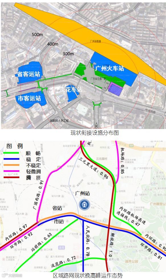 广州站由于地处城市中心,地区交通整体需求较大。铁路客运与城市客运设施的衔接较差,省、市长途客运站距火车站超过400米,出租车候车时间长,公交系统整体接驳服务水平不高,小汽车接送不便利。地区道路疏解方向较为单一,由于铁路线的分隔,形成了现状“艹”字型路网结构,单一依靠向南疏解,运作不稳定,内环路、大北立交、解放北路等拥堵时有发生。