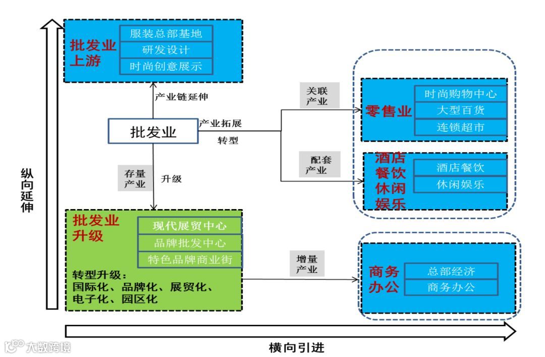 广州站现状交通地区现状交通服务能力饱和,交通需求大的重要原因,除了自身承担的对外交通服务功能外,站点周边功能混杂,大量批发带来的货运交通影响非常大。因此,规划除了提高周边道路等交通通勤效率外,首先应从地区本身产业出发,减少货运交通出行,引导对交通影响巨大的批发业转型升级,将批发业专业转化成为零售商业、百货以及酒店餐饮、娱乐等配套产业;其次,将既有的服装、皮具批发产业链延伸至批发业上游,发展成为服装设计、研发以及时尚创意产业;第三,实现批发行业升级,发展现代展贸中心、特色品牌商业街等。