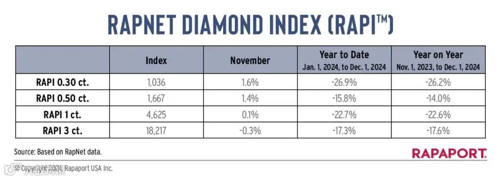Rapaport数据显示,11月0.3克拉、0.5克拉和1.0克拉钻石的Rapnet价格指数分别上升1.6%、1.4%和0.1%,3克拉钻石的Rapnet指数下降0.3%。